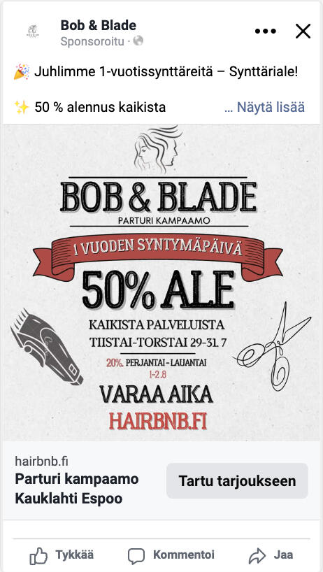 Moni luulee, että tuloksia saa vain valtavilla mainosbudjeteilla, mutta todellisuudessa ratkaisevaa on oikea kohdennus ja viesti, joka osuu asiakkaisiin.Hyvä esimerkki on Bob & Blade -kampaamo jolle loimme kampanjan, jonka bujetti oli vain 50 euroa, siitä riippumatta onnistuimme varamaan kalenterin täyteen heille!Nionmedialla keskitymme siihen, että jokainen euro tuottaa takaisin moninkertaisesti.